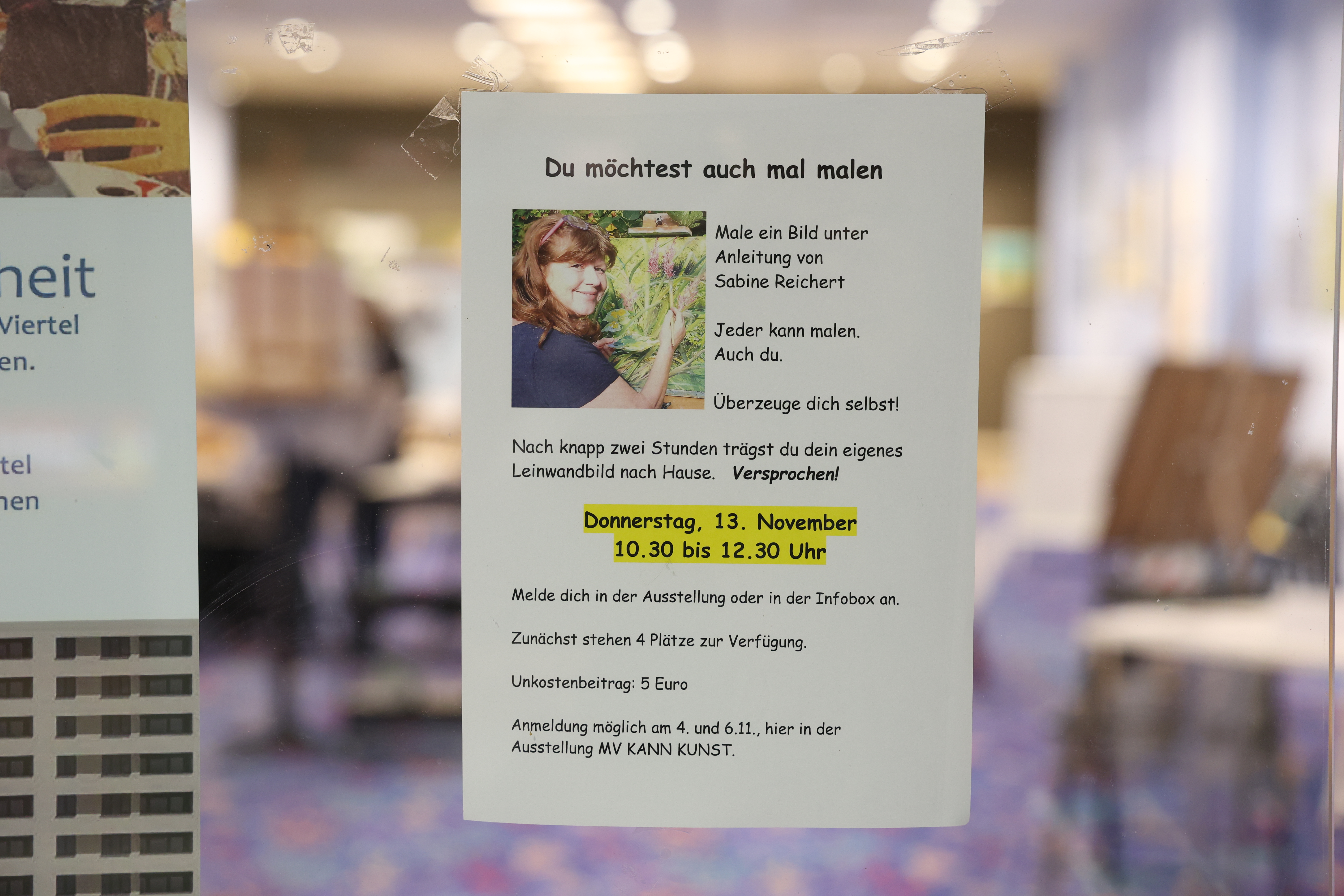 Ein Jahr später, ist dieser Raum Wirklichkeit. Der Kunstraum im Märkischen Zentrum ist kein exklusiver Ort, sondern einer, der im Herzen des Viertels liegt, dort, wo Menschen täglich vorbeigehen, einkaufen, reden, leben. Dass eine Ausstellung wie MV KANN KUNST überhaupt möglich wurde, verdankt sich auch dem Vertrauen des Managements des Märkischen Zentrums.