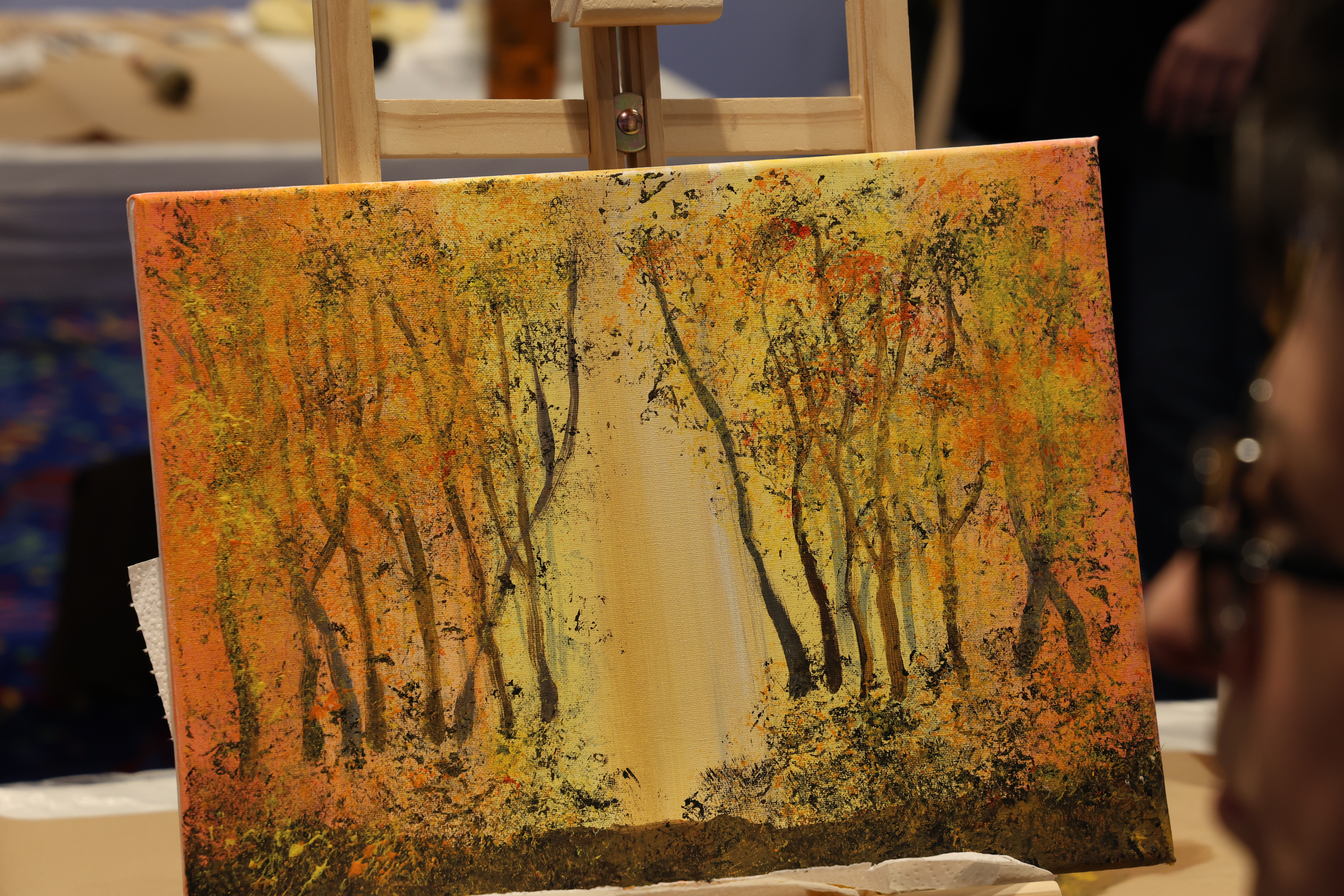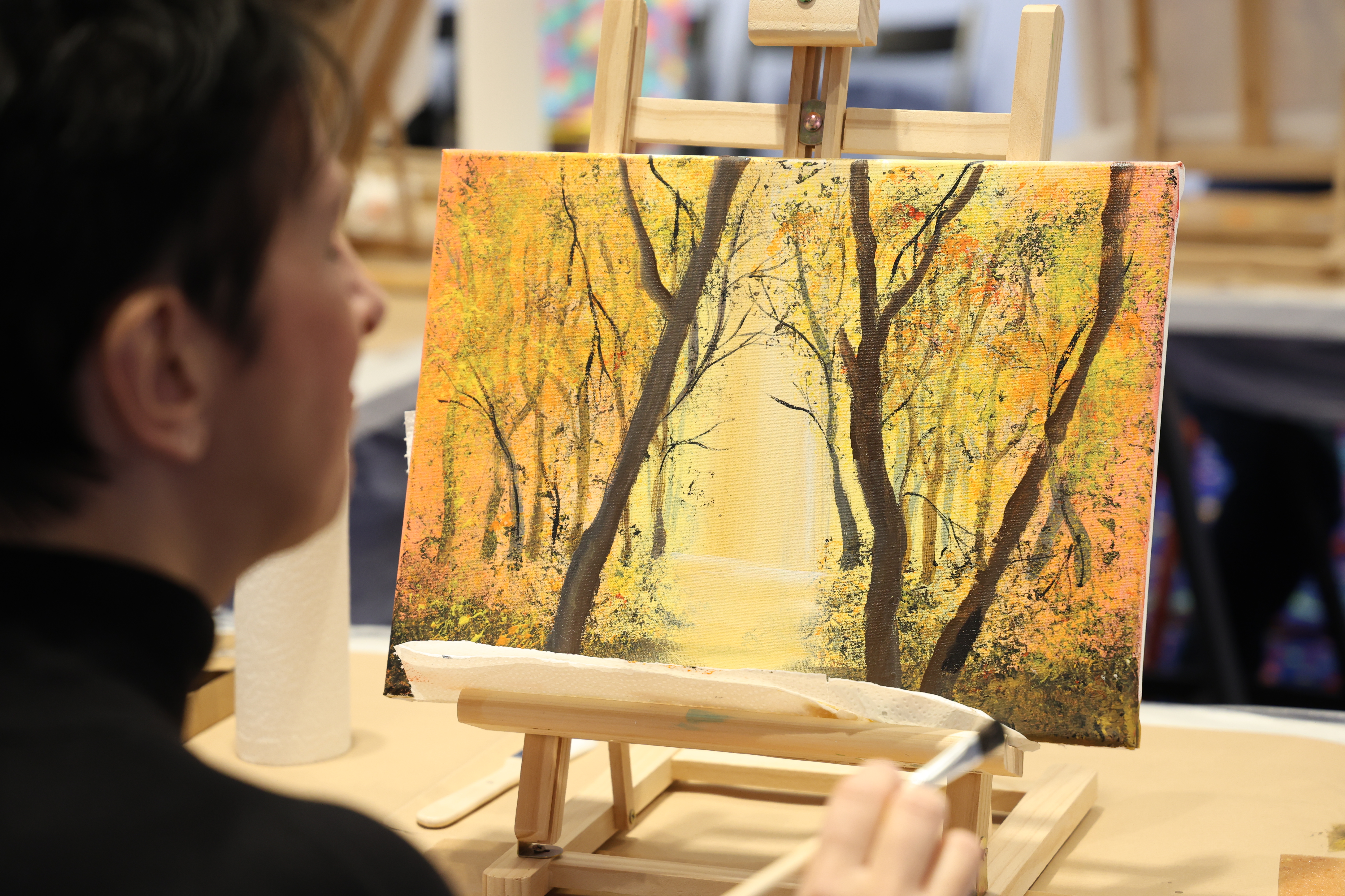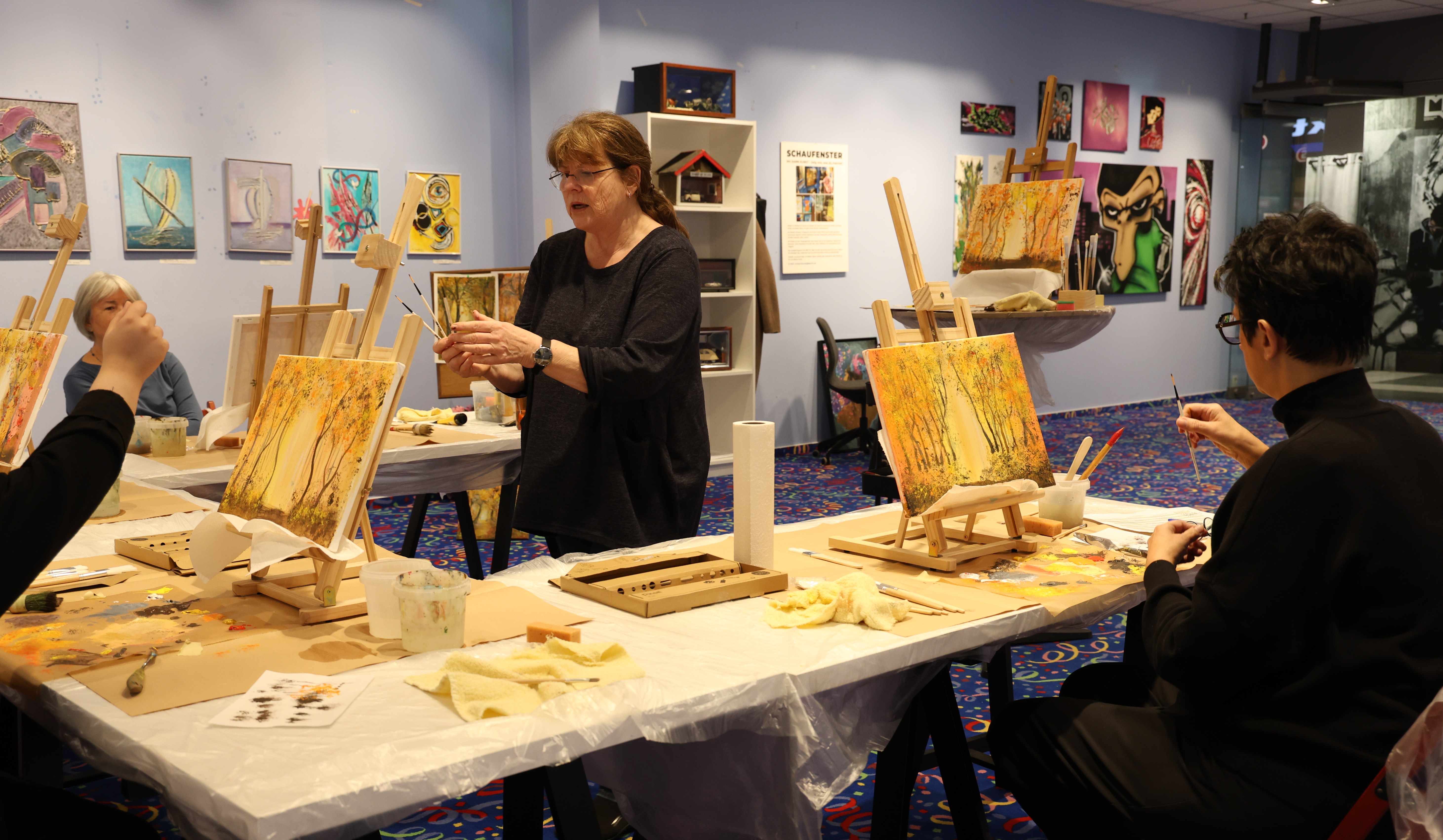 Die Teilnehmenden begannen mit einem hellen Hintergrund, auf dem sich Bäume nur zart abzeichneten. Nach und nach entstanden neue Ebenen, bis sich im Vordergrund kräftigere Formen zeigten. Sabine Reichert erklärte unterschiedliche Pinsel und zeigte, wie jeder Schritt funktioniert. Sie ging aufmerksam von Tisch zu Tisch, gab Hinweise, zeigte Bewegungen vor und half jedem einzeln, damit die eigene Bildidee sichtbar werden konnte.