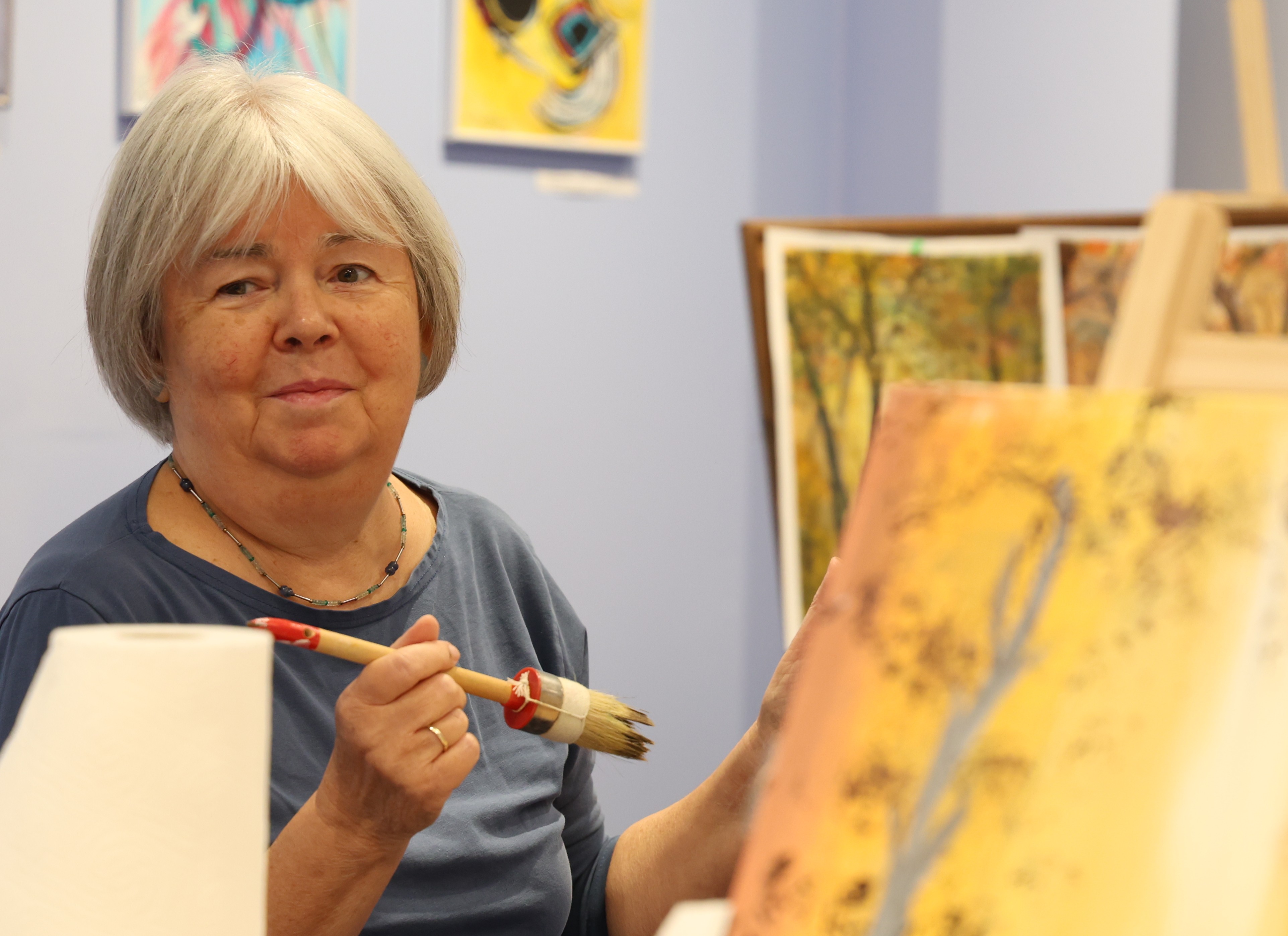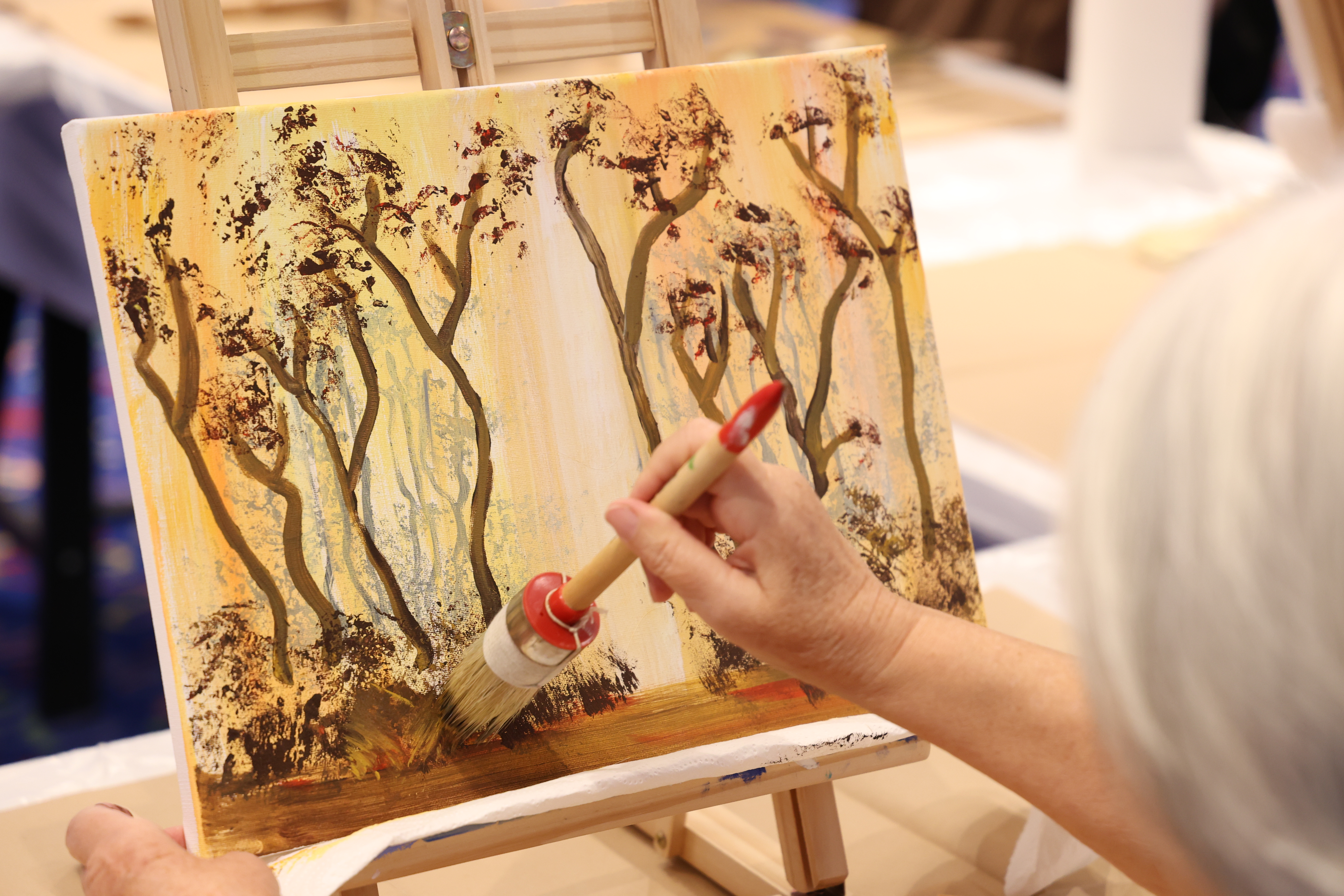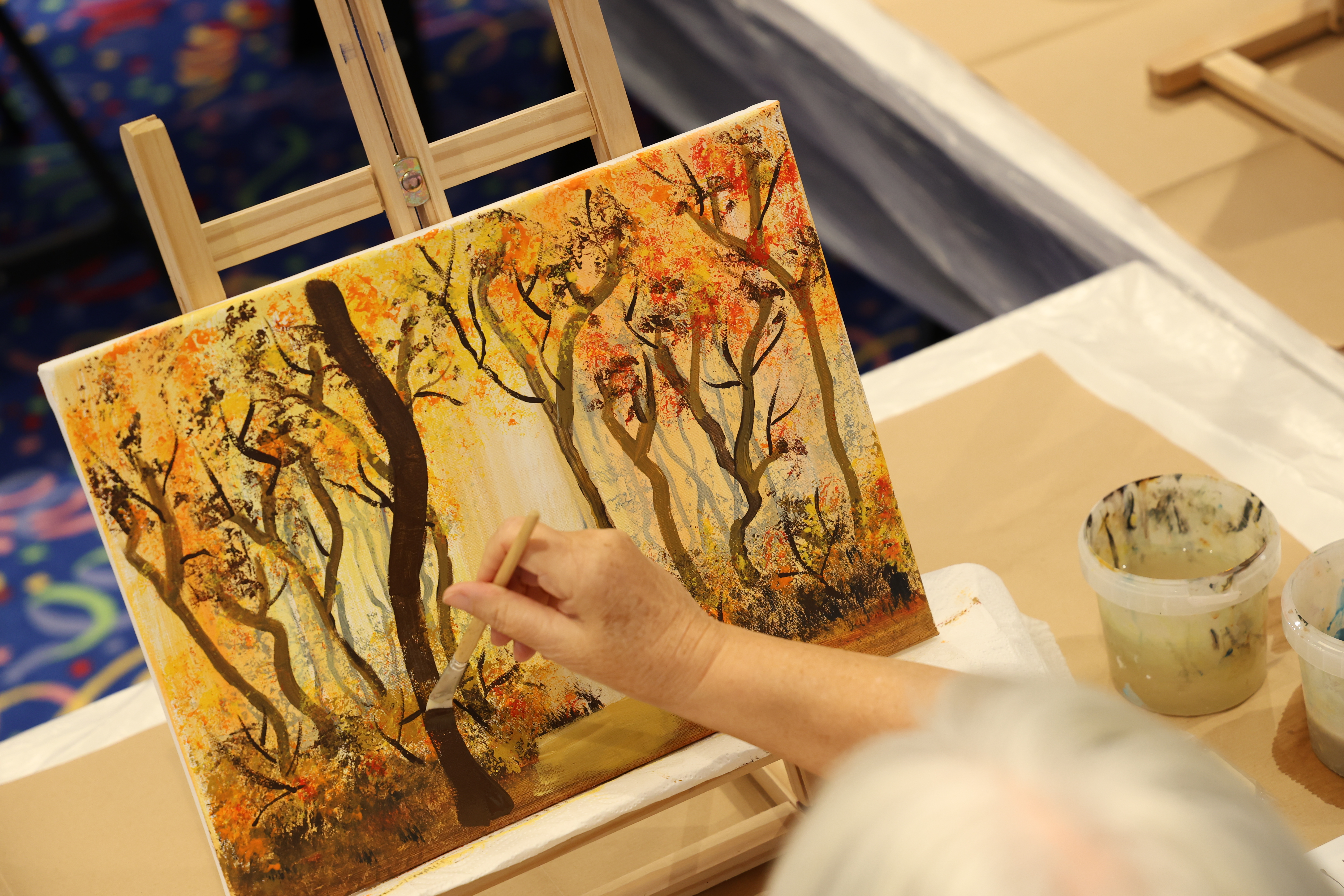 Die Teilnehmenden begannen mit einem hellen Hintergrund, auf dem sich Bäume nur zart abzeichneten. Nach und nach entstanden neue Ebenen, bis sich im Vordergrund kräftigere Formen zeigten. Sabine Reichert erklärte unterschiedliche Pinsel und zeigte, wie jeder Schritt funktioniert. Sie ging aufmerksam von Tisch zu Tisch, gab Hinweise, zeigte Bewegungen vor und half jedem einzeln, damit die eigene Bildidee sichtbar werden konnte.