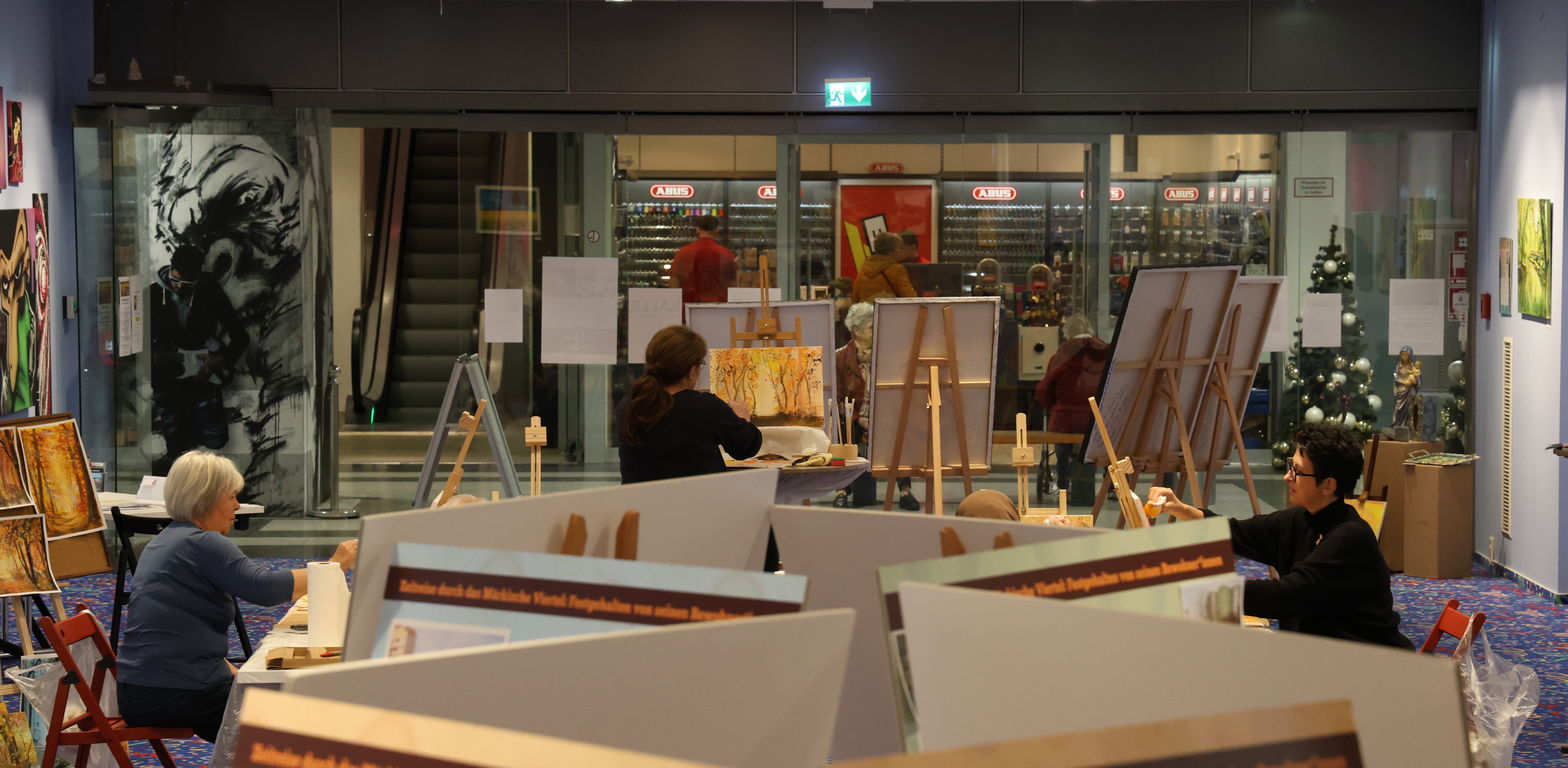 Im Ausstellungsraum von MV KANN KUNST, dem ehemaligen Partyland im Märkischen Zentrum, fand am Donnerstag den 13. November ein Workshop statt, der Menschen aus dem Viertel für eine Weile aus dem Alltag holte. Von 10:30 Uhr bis 12:00 Uhr führte Sabine Reichert durch eine Maltechnik, die Schicht für Schicht Tiefe erzeugt und am Ende von einem sanften Lichtschimmer getragen wird.