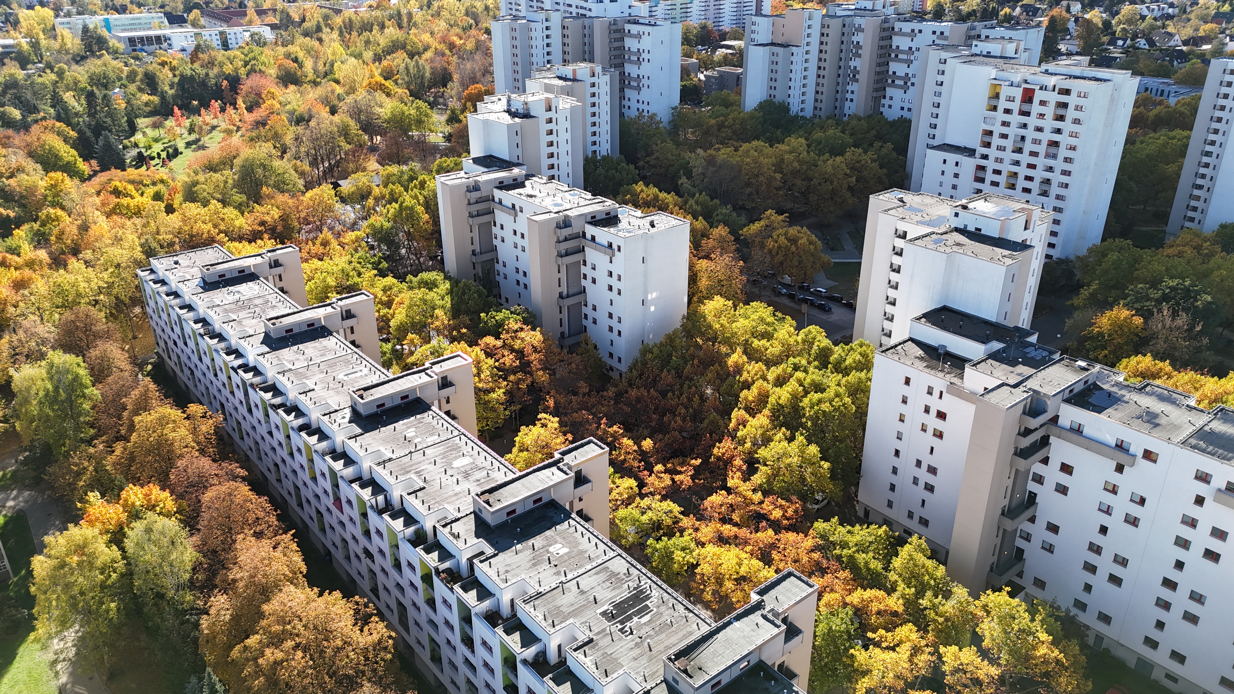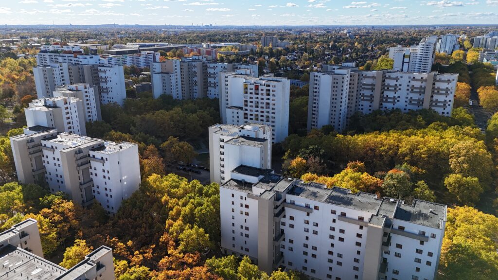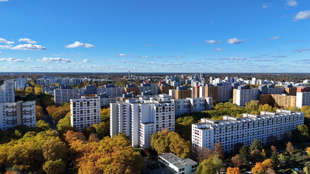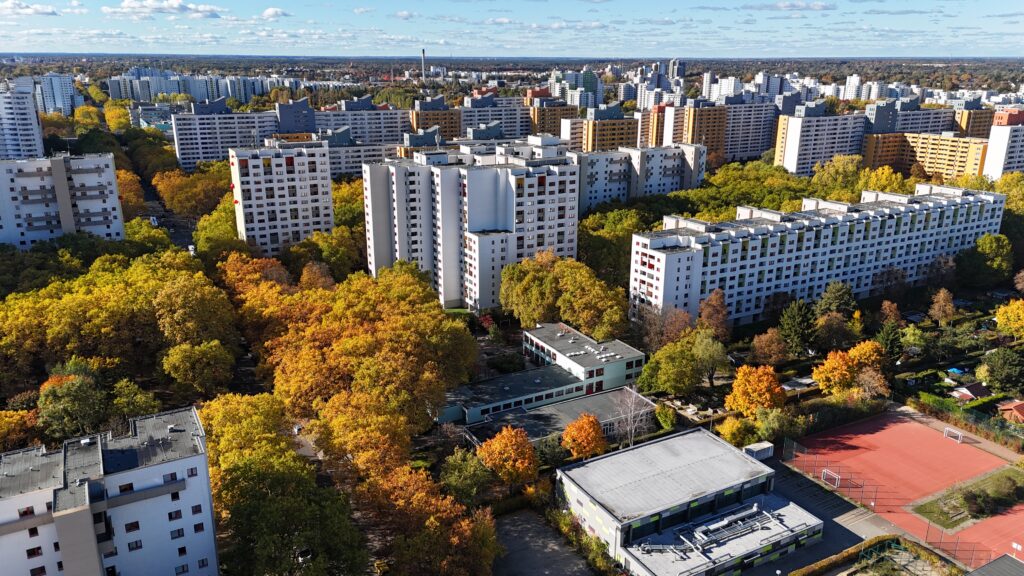 Über dem Stadion an der Finsterwalder Straße liegt diese besondere Ruhe, die hier aus der Höhe spürbar wird.18.10.2025 – Mittagssonne über dem Wilhelmsruher Damm. Die Fassaden des Märkischen Viertels leuchten, als hätte der Herbst selbst beschlossen, hier noch einmal alles zu zeigen, was Farbe kann.
