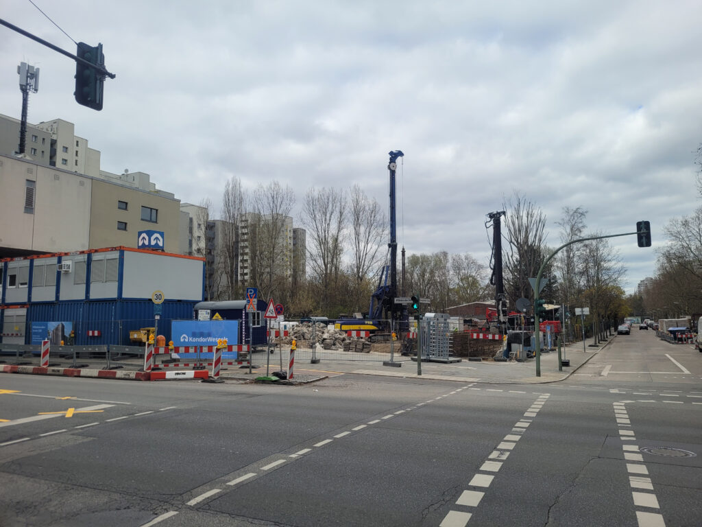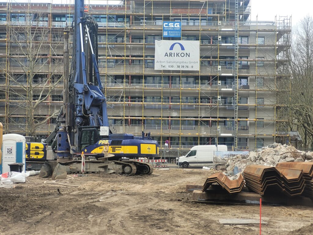 Die aktuellen Aufnahmen vom 3. April 2026 zeigen den Stand der Arbeiten am Wilhelmsruher Damm 150. Das ehemalige Postgebäude ist inzwischen vollständig abgetragen. Im Zentrum der Baustelle steht ein Großbohrgerät. Solche Geräte werden in dieser Bauphase in der Regel für die Herstellung von Bohrpfählen eingesetzt. Diese dienen als Fundament für das geplante Hochhaus.