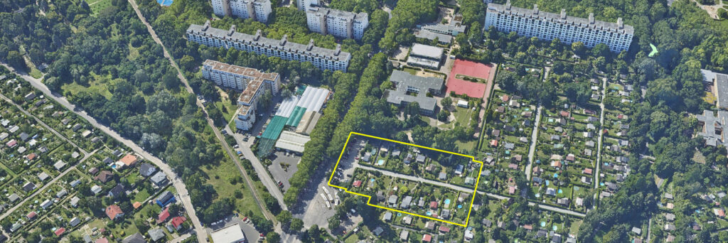 Für den Neubau soll ein Teil der bestehenden Kleingartenanlage weichen. Konkret betrifft das 18 Gartenparzellen. Laut Ausschreibung sind außerdem die Parkfläche der Anlage sowie die bisherige Haupterschließung betroffen. Die übrigen 72 Parzellen im nördlichen Bereich sollen erhalten bleiben. Für sie ist eine neue Zufahrt erforderlich, da der bisherige Zugang durch die geplante Bebauung entfällt.