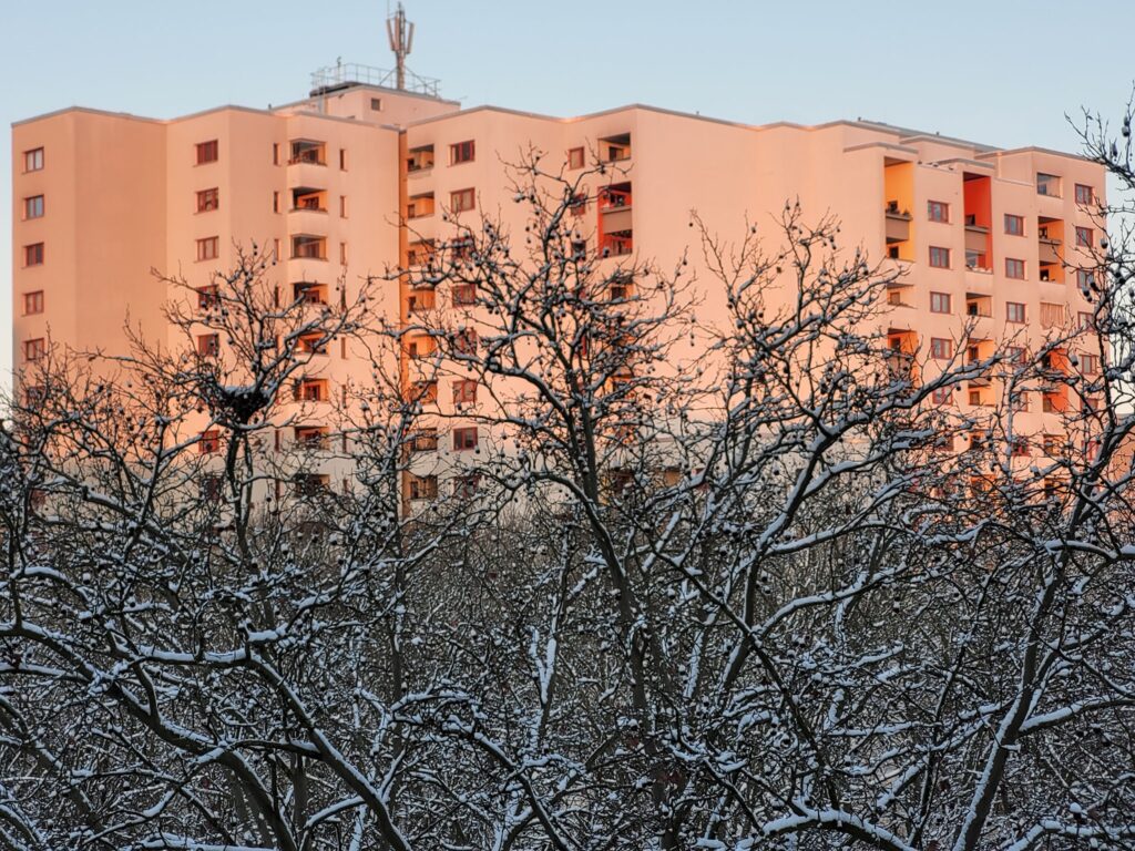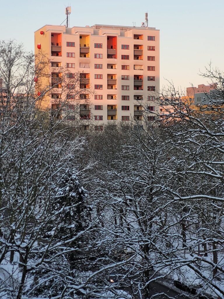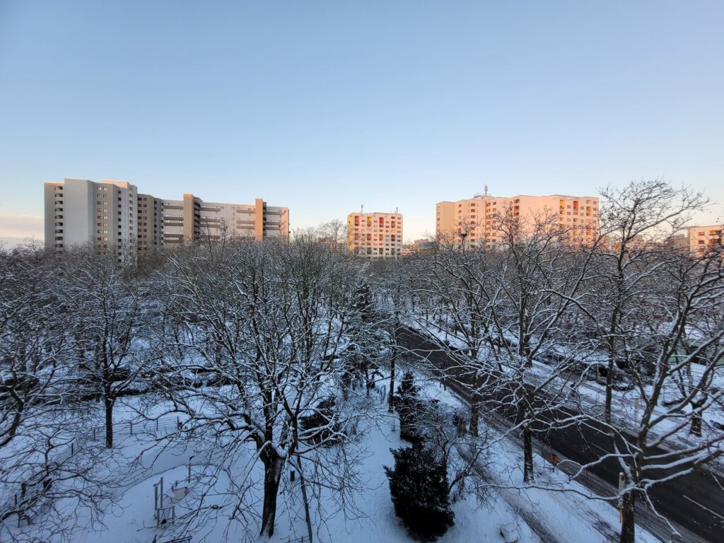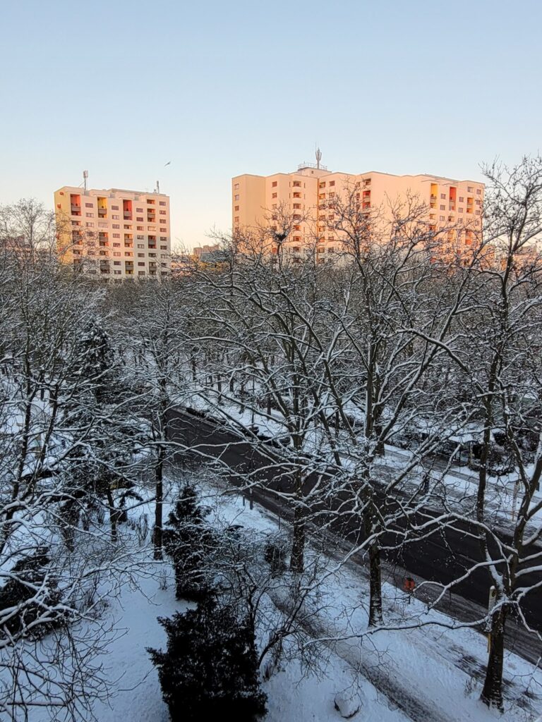 Auch heute liegt noch Schnee im Märkischen Viertel. Die Wege sind weiß, die Bäume tragen eine dünne Schicht, die Kulisse wirkt verändert. Der Winter ist spürbar angekommen.