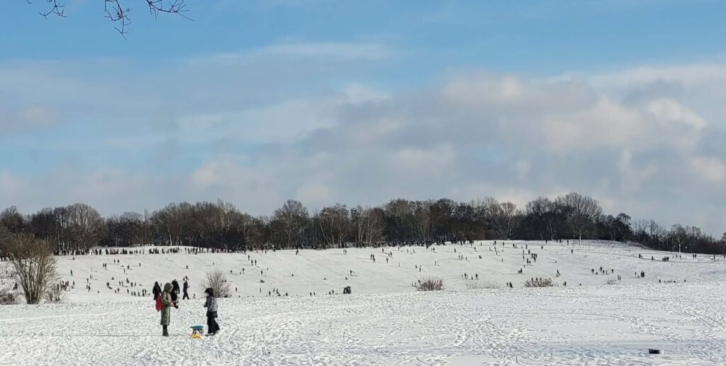 Besonders toll war es auf dem Müllberg/Lübarser Höhe. Auch der Rodelberg am Senftenberger Ring Nord war stark genutzt. Kinder, Jugendliche und Erwachsene fuhren nebeneinander den Hang hinunter, warteten, liefen wieder hoch, lachten, riefen sich zu. Es waren Bilder, die man im Alltag des Viertels nicht oft sieht.
