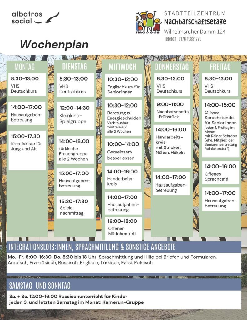 Für weitere Informationen: E-Mail an c.doebler@albatrosggmbh.de oder telefonisch unter 0176 19831270. Hier geht es zur Internetseite: https://www.albatrosggmbh.de/stadtteilarbeit-und-nachbarschaft/stadtteilzentren/maerkisches-viertel/beschreibung.html
