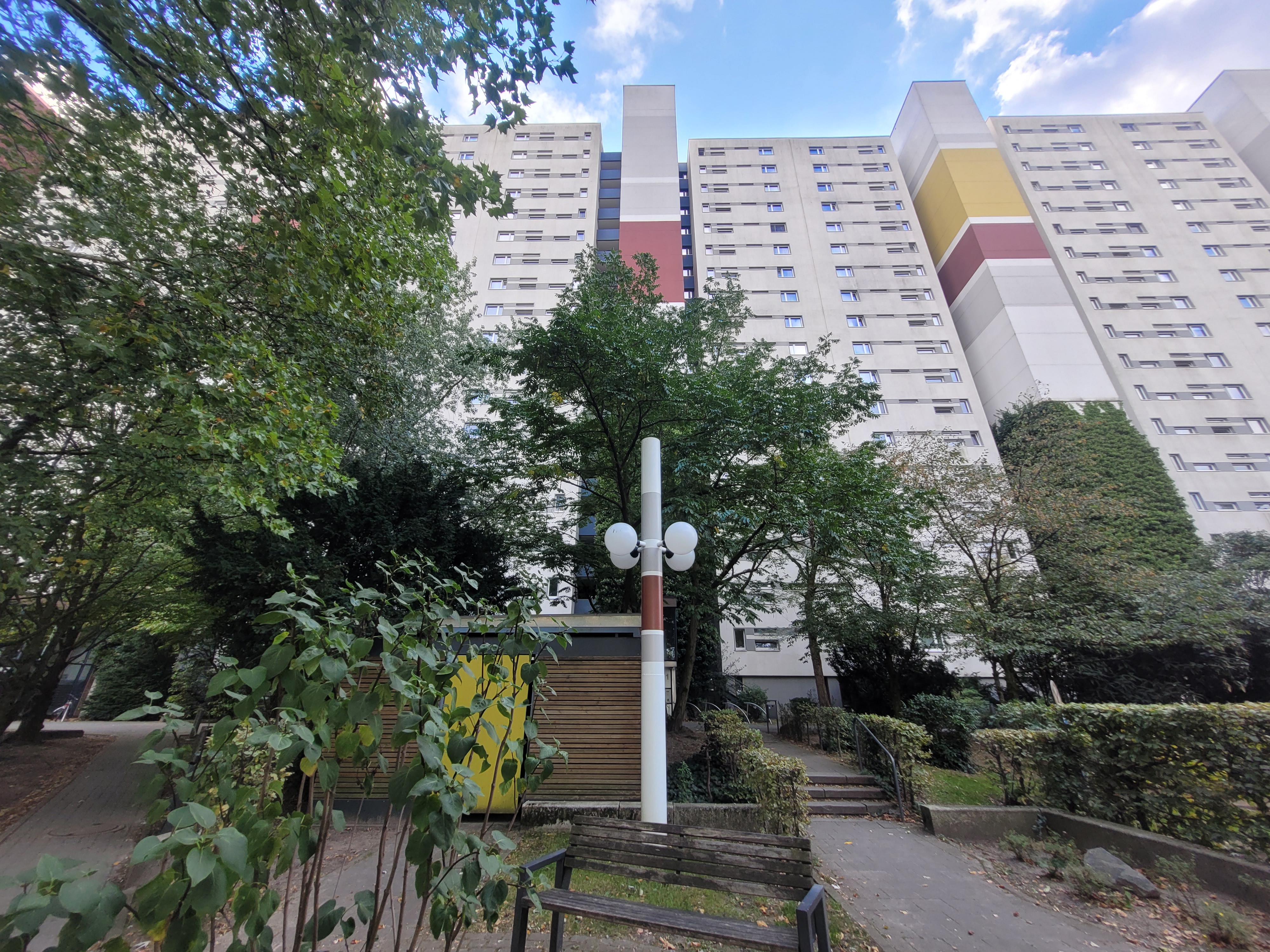 Was vielen aber entgeht, sind die stillen Zwillinge davor: die alten Lampen mit ihren vier runden Leuchten. Ihre Masten tragen dieselben Farben wie die Treppenhaussäulen an der Fassade, Ton in Ton, abgestimmt bis ins Detail. Ein Stück Architekturgeschichte, das zeigt, wie sehr selbst die alltäglichsten Dinge Teil eines größeren Farbenspiels sind.