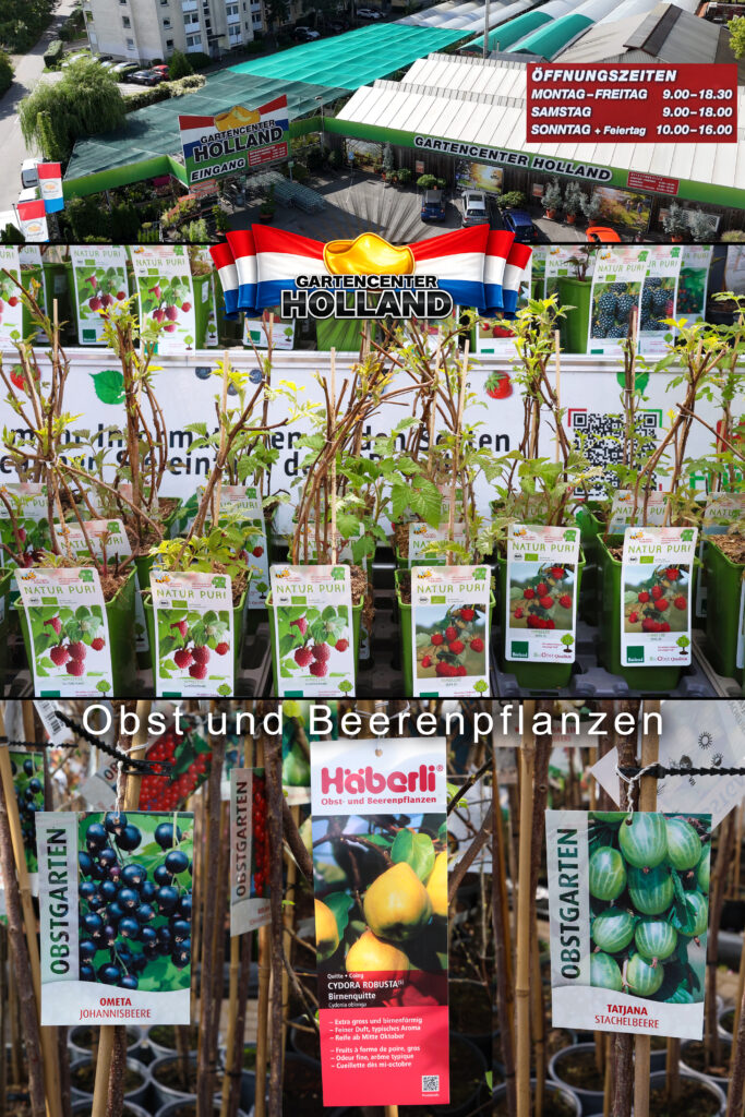 Im Gartencenter Holland stehen aktuell viele Obst und Beerenpflanzen bereit. Darunter sind Johannisbeeren, Stachelbeeren, Himbeeren sowie auch kleinere Obstbäume wie Quitten und viele mehr. Die Pflanzen sind noch kompakt im Topf, zeigen aber bereits erste Triebe und geben einen Eindruck davon, was später im Garten wachsen kann.