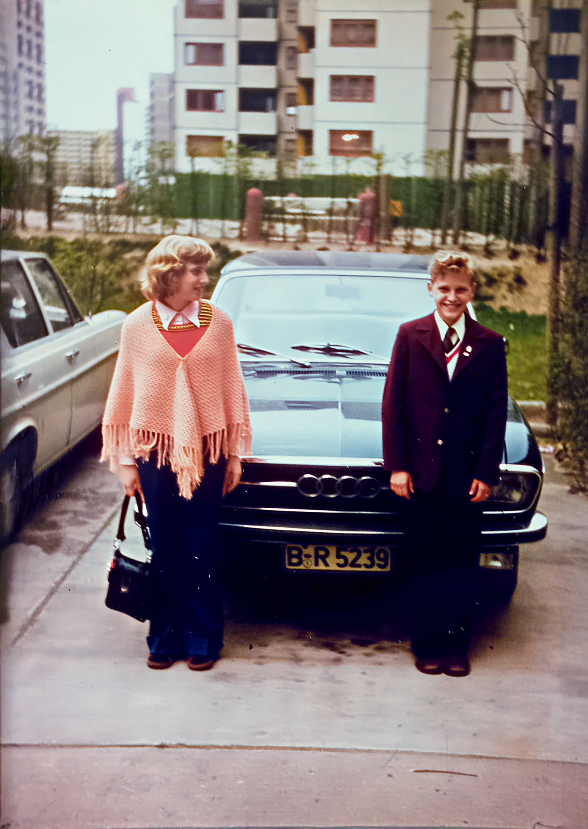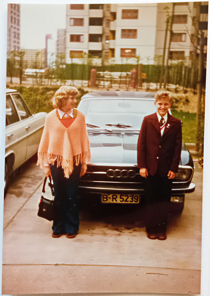 Dieses noch nie zuvor veröffentlichte und von uns nachgeschärfte Foto aus Frank Schümanns Sammlung (1979) führt zurück in jene Jahre, in denen das Märkische Viertel noch in seiner ersten Lebensphase stand. Auf einem Parkplatz in der Tiefenseer Straße stehen zwei Wagen nebeneinander, beide aus dem Besitz seines Vaters.