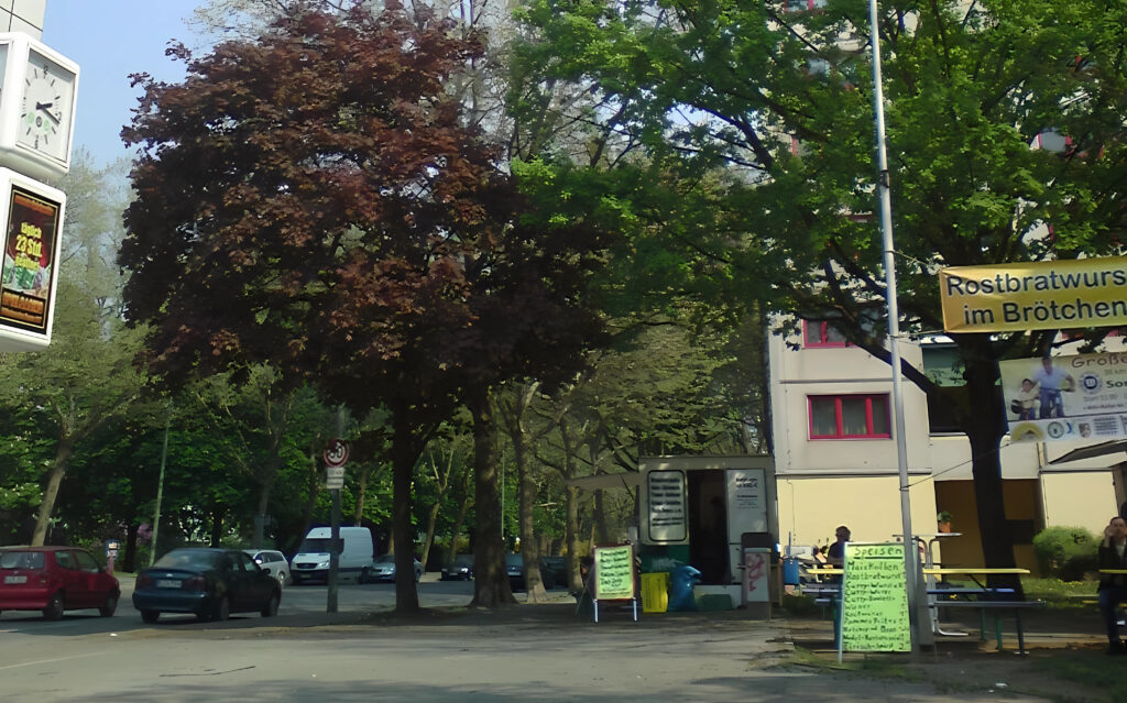 Direkt in der Nähe befand sich später ein Imbiss. Kein schicker Laden, sondern ein klassischer Treffpunkt. Rostbratwurst im Brötchen, Currywurst, Wiener, Pommes, Maiskolben, Getränke. Man holte sich etwas zu essen, setzte sich draußen hin, blieb sitzen. Viele kamen regelmäßig, manche nur zufällig, andere wurden mit der Zeit Stammgäste.