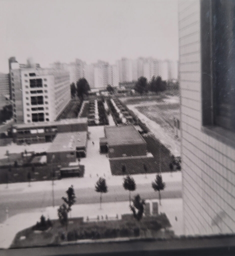 Ein Fenster in die Vergangenheit: Blick vom Hochhaus am Senftenberger Ring (Wahrscheinlich 76 oder 78) auf den wachsenden Rohbau des Hotel Rheinsberg.