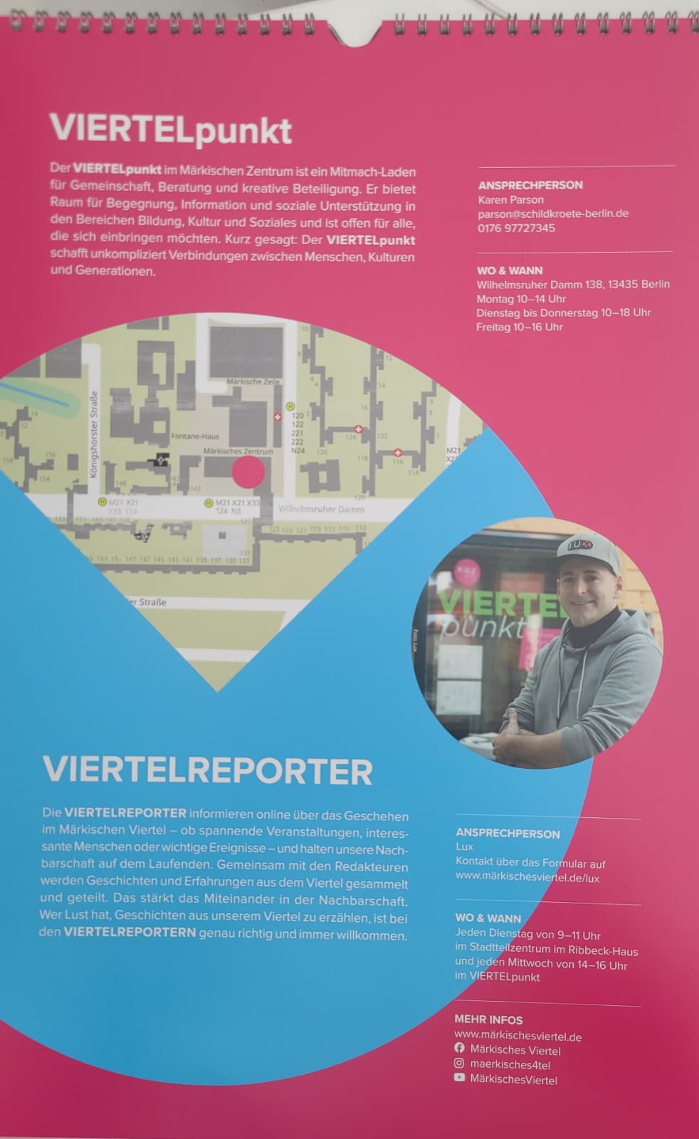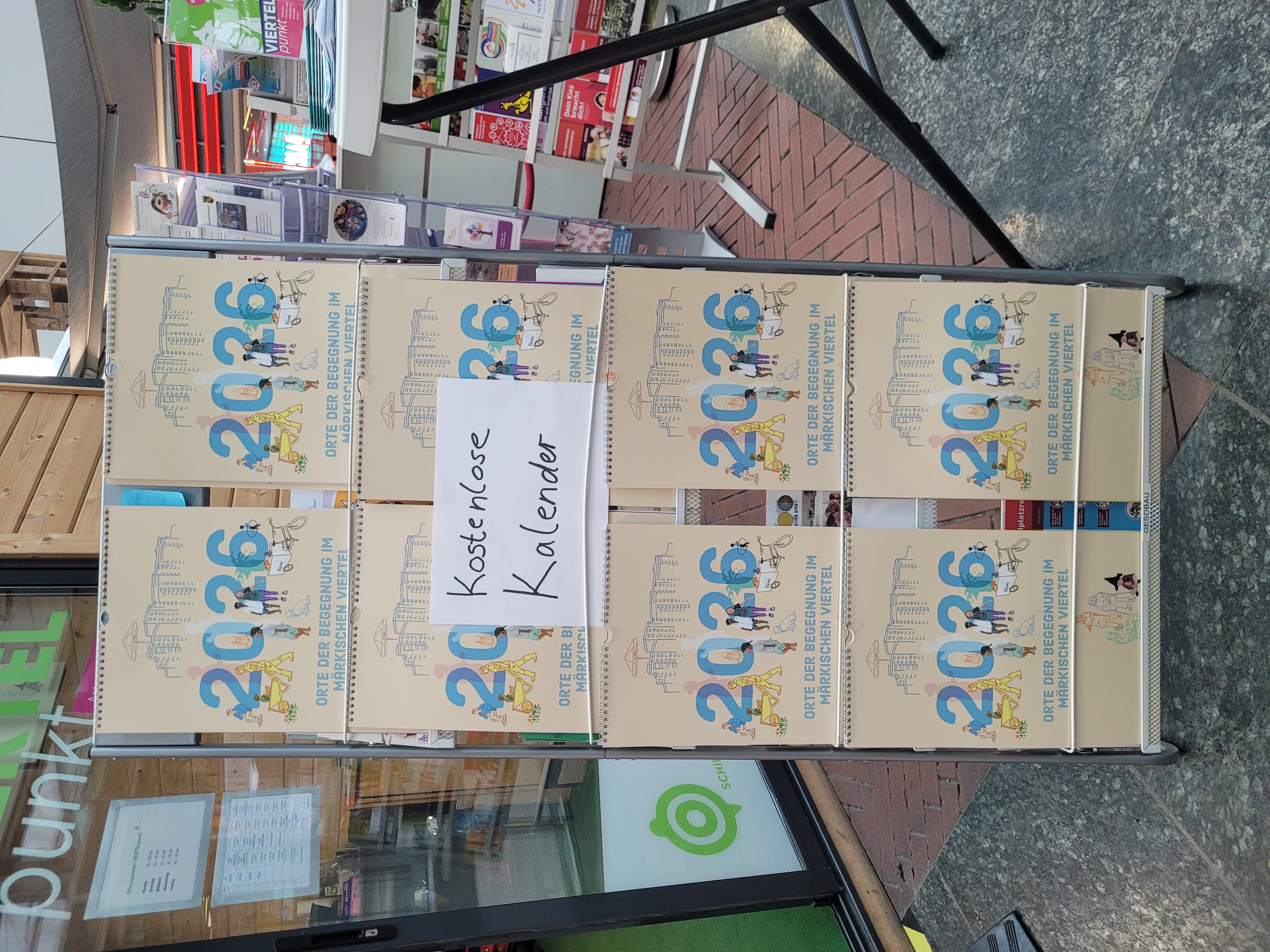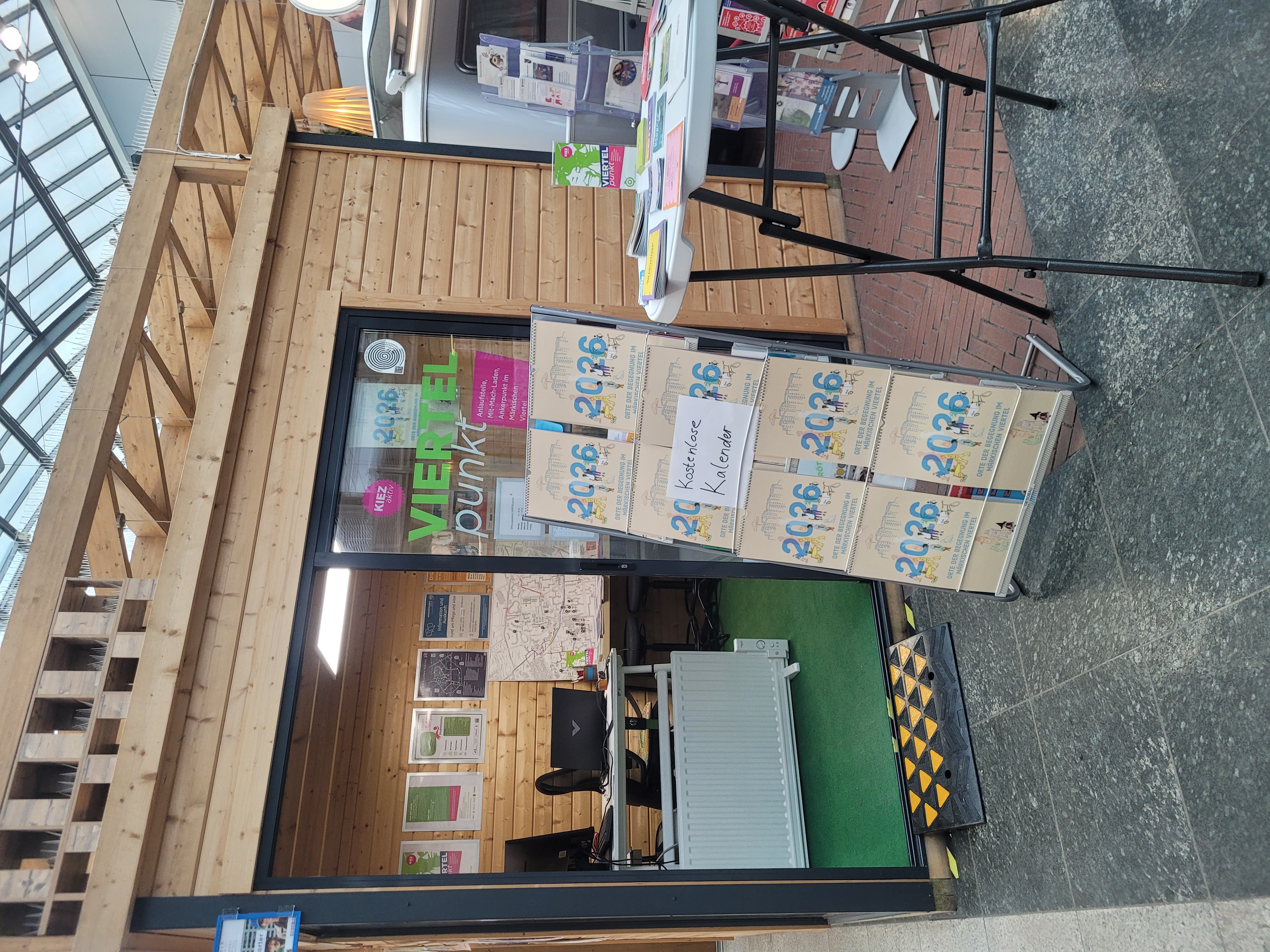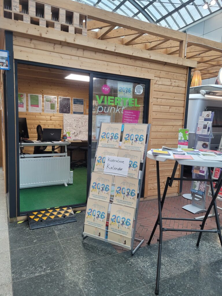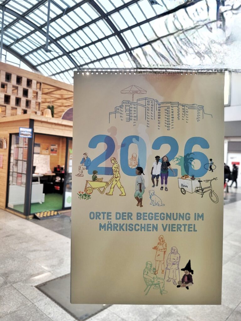 Im VIERTELpunkt liegt ein kostenloser Wandkalender aus. Er trägt den Titel Orte der Begegnung im Märkischen Viertel und stellt Monat für Monat Einrichtungen und Treffpunkte vor, die den Alltag im Viertel prägen. Der Kalender ist kostenlos erhältlich und richtet sich an alle und an die sich im Viertel orientieren oder neue Angebote kennenlernen möchten.