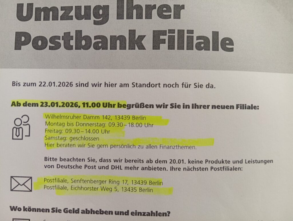 Der Postbank Filiale im Märkischen Viertel steht ein Standortwechsel bevor. Bis einschließlich 22. Januar 2026 bleibt die bisherige Filiale noch geöffnet. Ab dem 23. Januar 2026 wird der Betrieb an einem neuen Ort fortgesetzt.