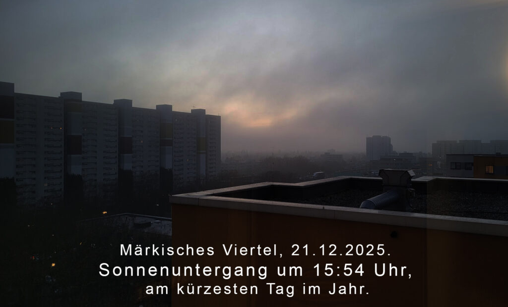 Dieses Foto wurde uns heute Morgen, den 12.1.2026 zugeschickt. Geschossen wurde es von Leserin Betty am Müllberg/Lübarser Höhe beim Sonnenaufgang um 8:00 Uhr.Blick über den Rand des Märkischen Viertels Verschneite Wohnblöcke, Nebenstraßen und Grünflächen am Übergang vom Märkischen Viertel Richtung Wittenau. Der Schnee liegt auf Dächern, Wegen und parkenden Autos, Straßenlampen und Wohnungslichter zeichnen klare Linien in die Nacht. Die Aufnahmen zeigen unterschiedliche Blickrichtungen vom höheren Standort bis hinunter in die Wohnhöfe und Wege am Rand des Viertels. Aufgenommen am Abend nach dem Schneefall. Fotos von HanneloreDas Foto ist 2024 im Märkischen Viertel entstanden, in der Gegend zwischen Märkischem Zentrum und der Märkischen Zeile. Wir haben es im Archiv wiedergefunden und teilen es hier nochmal.Im Märkischen Viertel beginnt der Sonnenuntergang heute um 15:54 Uhr und weil heute der kürzeste Tag des Jahres ist, fühlt sich jede Minute Licht ein bisschen kostbarer an. Die bürgerliche Dämmerung endet um 16:35 Uhr, die nautische Dämmerung um 17:20 Uhr und richtig dunkel im astronomischen Sinn wird es gegen 18:02 Uhr sein. Die Wintersonnenwende liegt heute bei 16:03 Uhr. Ab heute werden die Tage wieder länger.Ein Ringlicht im Himmel Dieses Leserfoto entstand im letzten Jahr (2024) in der Wesendorfer Straße, aufgenommen aus dem 12. Stock. Der Blick geht Richtung Senftenberger Ring West. Zwischen den Häusern liegt viele Grün unseres Viertels, darüber öffnet sich die Wolkendecke und lässt ein kreisförmiges Leuchten hindurch.Diese Aufnahme, hat unserer Viertelreporter HighFly, am Heizkraftwerk Märkisches Viertel gemacht und dieses mal ist er dafür am auf dem Boden geblieben. Vielen lieben Dank dafür. Wer mehr über unser Kraftwerk erfahren möchte, findet hier einen interessanten Beitrag dazu.Diese beiden beeindruckenden Fotos, aus unserem Märkischen Viertel, erreichten uns gestern Nachmittag. Wir bedanken uns bei Veronika und teilen die sehr gerne hier bei uns.So leuchtet das Märkische Viertel, wenn die meisten schon längst vom Tag abschalten. Wilhelmsruher Damm und Dannenwalder Weg festgehalten per Langzeitbelichtungen. Das Märkische Viertel ist hier nicht Kulisse, sondern Hauptrolle.Am Freitag, den 21.11.2025 rollte ein imposanter Abschleppwagen durch das Märkische Viertel, im Schlepptau ein BVG-Bus. Ein Bild, das man im Alltag selten bewusst wahrnimmt und zumindest unseren Viertelreporter kurz staunen ließ. Natürlich war klar: Der Bus hatte eine technische Panne und musste in die Werkstatt gebracht werden. Trotzdem dachte man sich für einen Moment mit einem Augenzwinkern: „Tja, Parkplatznot im Märkischen Viertel, da wird inzwischen wirklich alles abgeschleppt.“ In Wahrheit steckt hinter so einer Szene eine Menge Arbeit: Fahrpersonal, Technikteams, Abschleppdienst und BVG-Einsatzkoordination sorgen dafür, dass die Linien schnell wieder rollen. Für uns war es einfach ein seltener Moment, eingefangen mitten am Senftenberger Ring.Ein Blick in die frostige Landschaft und ein Hinweis für alle, die draußen unterwegs sind Diese beiden Fotos stammen von Leserin Luisa, aufgenommen heute Morgen (21.11.2025) von der Finsterwalder Richtung Wittenau/Waidmannslust. Kein direkter Blick ins Märkische, aber nah genug, um die Stimmung der vergangenen Nacht einzufangen. Die Kälte hat sichtbar Spuren hinterlassen.