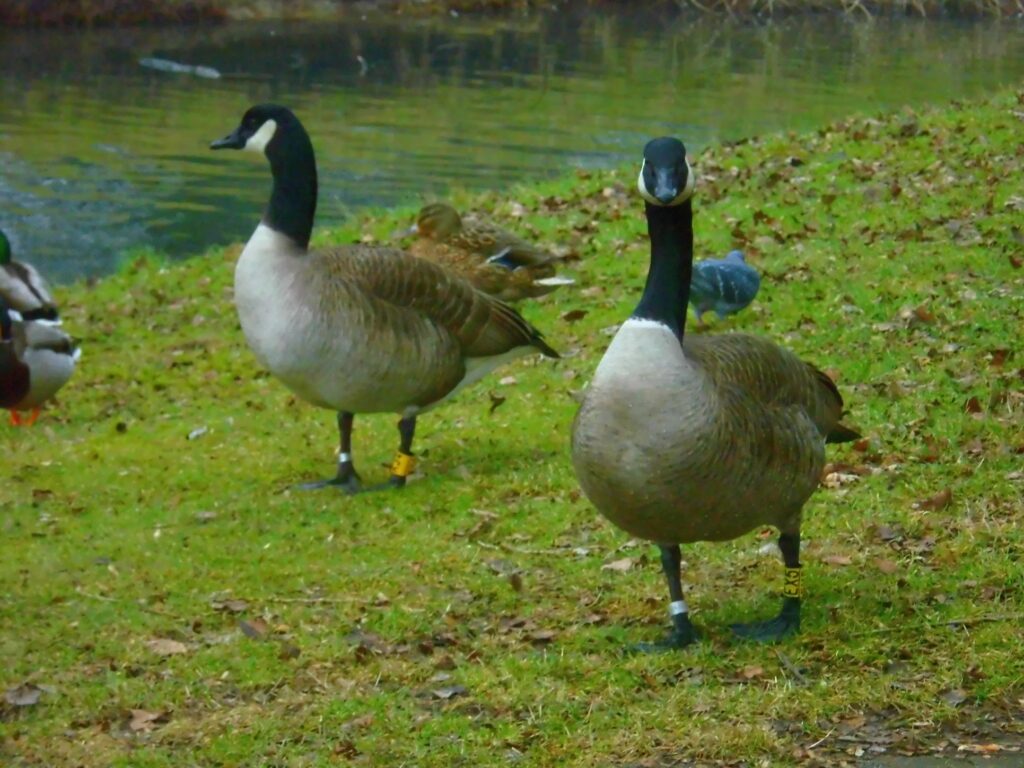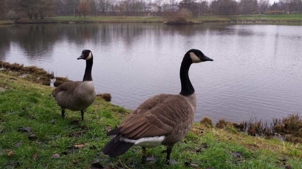 Auf dem einen Bild sind Kanadagänse gemeinsam mit Stockenten zu sehen. Diese Nähe ist im Viertel nichts Ungewöhnliches. Die Arten nutzen ähnliche Lebensräume, gehen sich meist aus dem Weg und haben feste Routinen entwickelt. Während Enten eher beweglich bleiben, stehen Gänse oft länger an einem Ort und behalten ihre Umgebung genau im Blick.