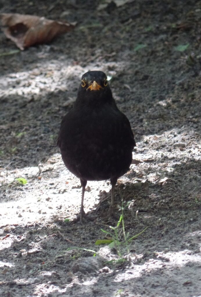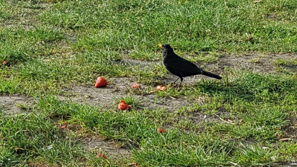 Besonders auffällig ist ihr Gesang, der vor allem in den frühen Morgen- und Abendstunden weit zu hören ist. Mit klaren, melodischen Strophen prägt die Amsel die Klangkulisse vieler Wohngebiete. Am Boden hüpfend oder kurz stehenbleibend sucht sie nach Würmern, Insekten, Beeren und Fallobst, wie auf dem Foto gut zu sehen.