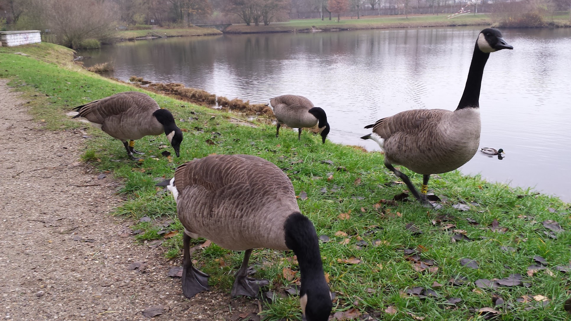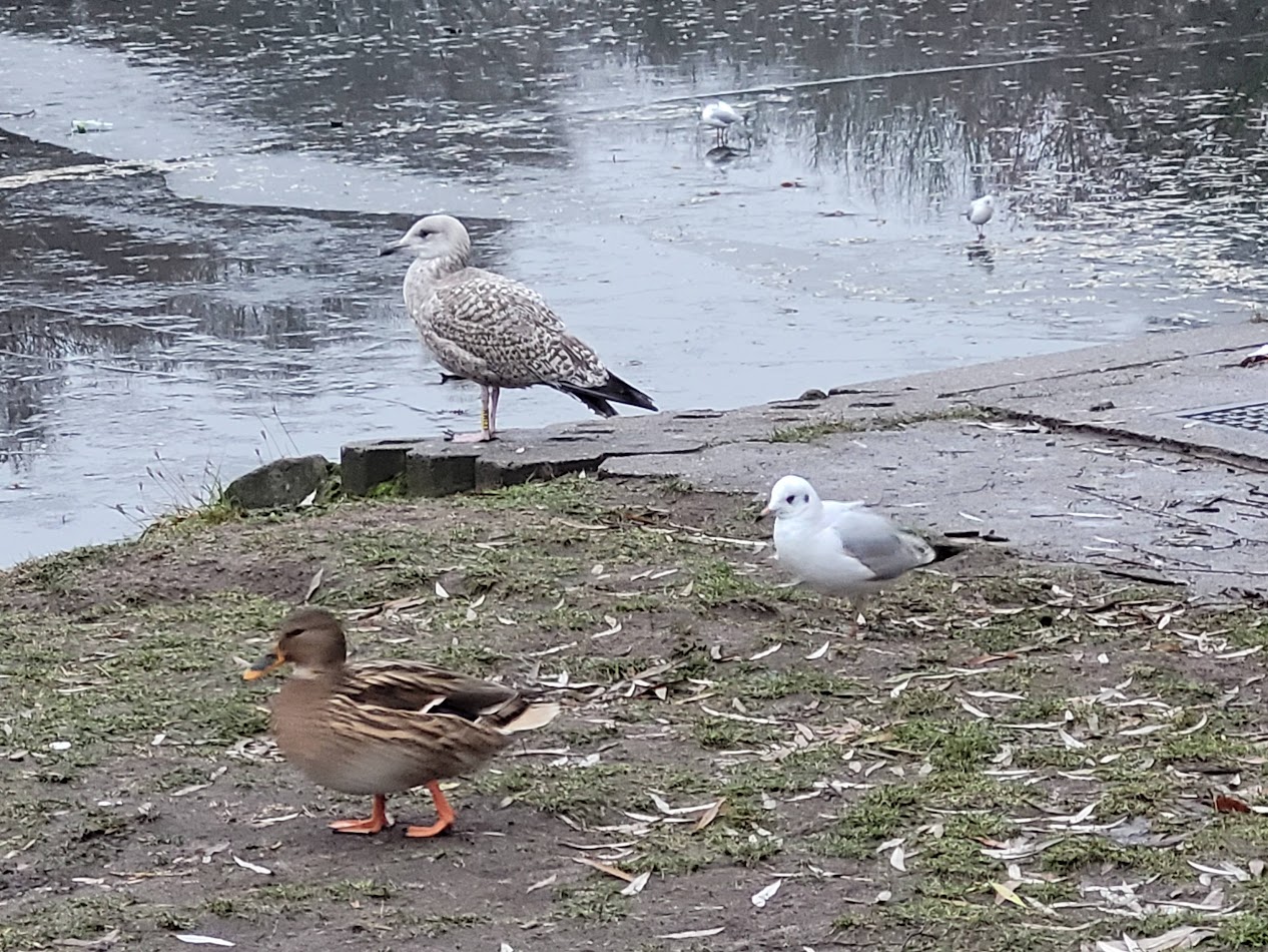 Auf dem einen Bild sind Kanadagänse gemeinsam mit Stockenten zu sehen. Diese Nähe ist im Viertel nichts Ungewöhnliches. Die Arten nutzen ähnliche Lebensräume, gehen sich meist aus dem Weg und haben feste Routinen entwickelt. Während Enten eher beweglich bleiben, stehen Gänse oft länger an einem Ort und behalten ihre Umgebung genau im Blick.