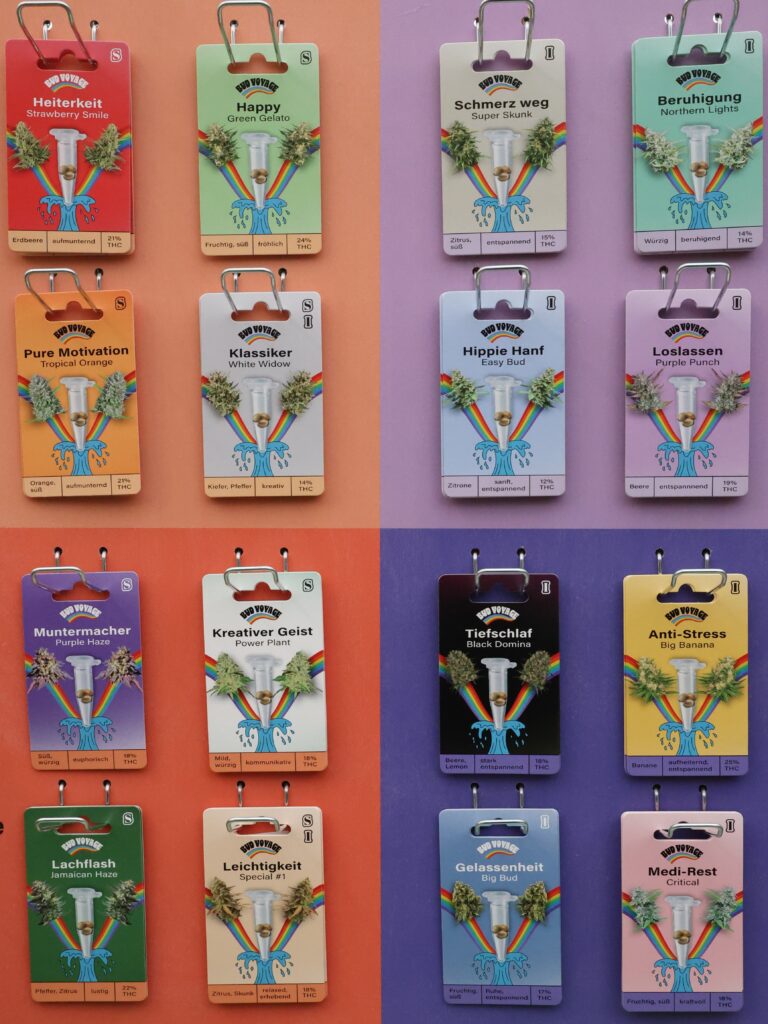 Zu den angebotenen Sorten gehören unter anderem Strawberry Smile, Green Gelato, White Widow, Super Skunk, Northern Lights, Purple Haze, Power Plant, Jamaican Haze, Black Domina, Big Banana, Big Bud und Critical. Auf den Karten sind jeweils kurze Angaben zu Aroma, Ausrichtung und THC Gehalt zu finden. Wer eine Sorte möchte, nimmt eine Karte vom Aufsteller, legt sie an der Kasse vor und bekommt die Samen dort ausgehändigt. Pro Kunde werden bis zu zwei Tütchen abgegeben.