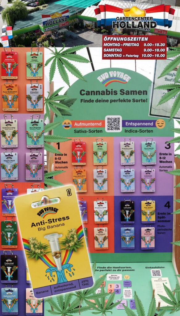 Im Gartencenter Holland am Wilhelmsruher Damm gibt es eine neue Produktlinie, die direkt im Kassenbereich präsentiert wird. Unterschieden wird zwischen Sativa Sorten mit aufmunternder Wirkung und Indica Sorten mit entspannender Ausrichtung. Zusätzlich gibt es Hinweise zur Anbauform.